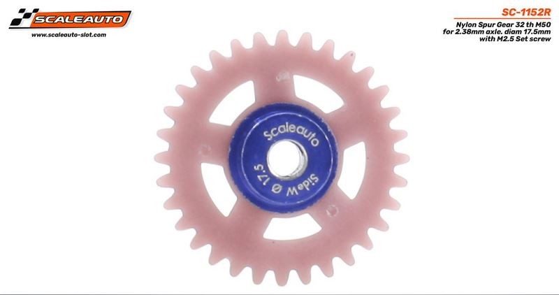Corona 32 dientes en sidewinder, fabricada en Nylon eje 2,38mm. Fijación por tornillo M2,5